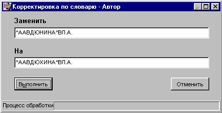 В строке ЗАМЕНИТЬ системой указывается исходное значение, подлежащее корректировке и соответствующее текущему термину СЛОВАРЯ, - это значение может совпадать с собственно термином словаря или представлять собой полные данные из документа, соответствующие этому термину (в частности, они могут содержать разделители подполей).
