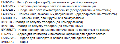 Для выходных форм TABZW («счет-фактура»), TPNZW (Адрес для конверта и почтовые карточки для одного заказа) и TABSZW (Адрес для конверта и список книг) — предварительного отбора не требуется: выбор организации и номера заказа для печати форм производится после выбора таблицы в листе опроса.